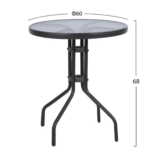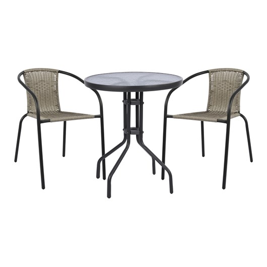 Αυτό το Σετ τραπεζαρίας εξωτερικού χώρου διαθέτει στρογγυλό τραπέζι με ΓΚΡΙ μεταλλικό σκελετό και γυάλινη θολή ΕΝΙΣΧΥΜΕΝΗ επιφάνεια, και 2 πολυθρόνες μεταλλικές με wicker πλέξη στην πλάτη, σε ΓΚΡΙ χρώμα.