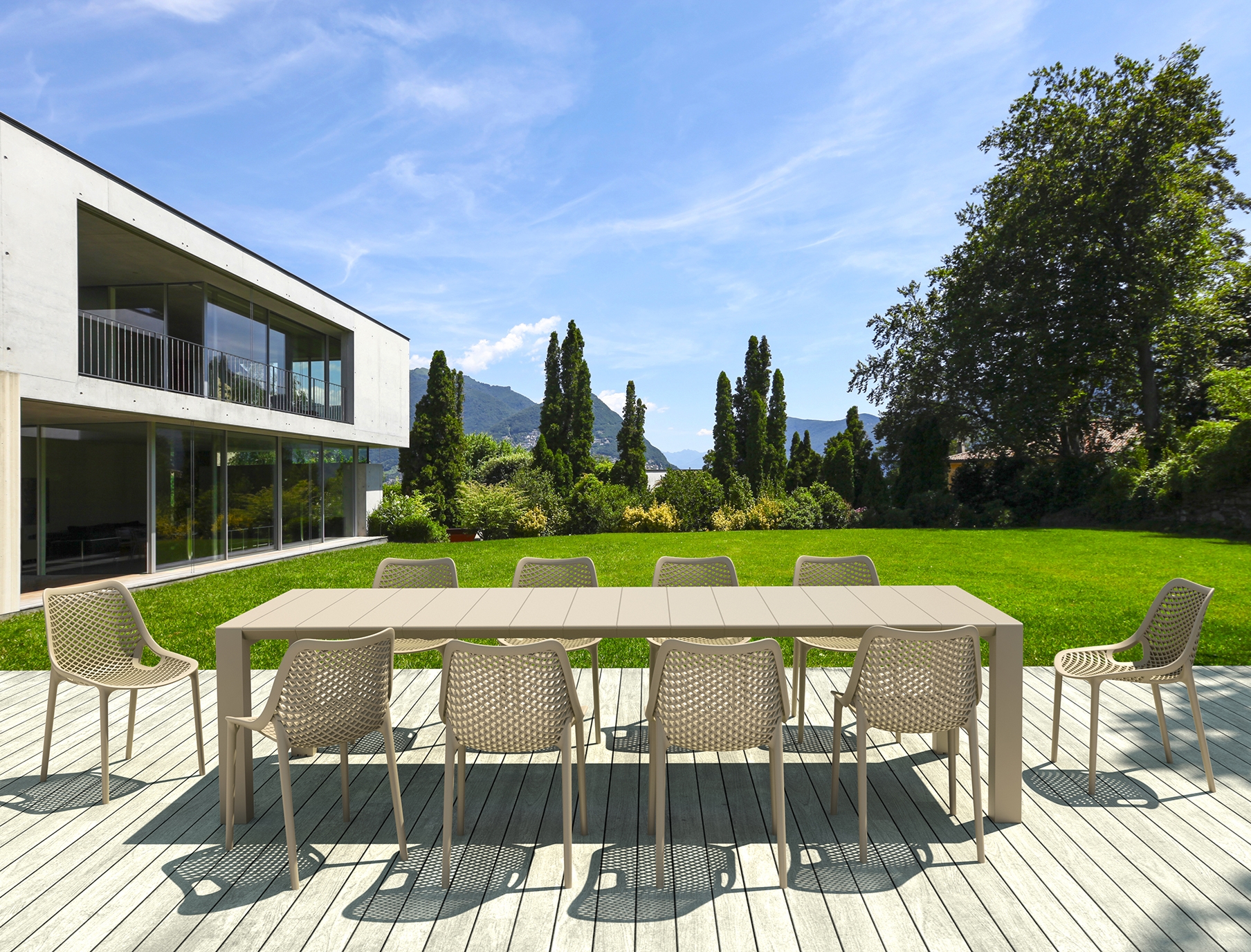 Set vegas τραπέζι 100X260/300 με 10 καρέκλες Air σε χρώμα taupe του οίκου Siesta. Κατασκευασμένα από πολυπροπυλένιο για απόλυτη αντοχή. Ένα set με ιδιαίτερο desing και άριστη κομψότητα ιδανικό για επαγγελματική και για οικιακή χρήση. Κατάλληλο για εσωτερικό και εξωτερικό χώρο. Διατίθεται σε χρώματα white, taupe, dark grey και black.