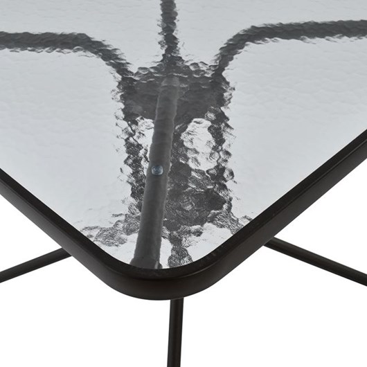 Ένα τραπέζι μεταλλικό εξωτερικού χώρου σε χρώμα καφέ, με ενσωματωμένο τζαμί ασφάλειας (secure).