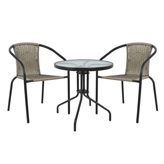 Η πλάτη και το κάθισμα είναι ντυμένα με πλεκτό συνθετικό υλικό wicker σε ανοιχτό γκρι χρώμα.
