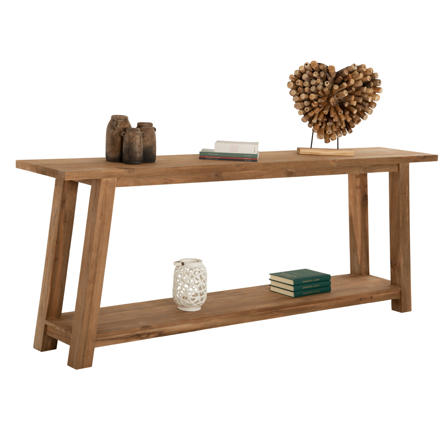HM9554---Κονσόλα από ξύλο ΤΕΑΚ σε κανονικό μακρόστενο ορθογώνιο σχήμα επιφάνειας. Στηρίζεται σε 4 πόδια και διαθέτει άλλη μια παρόμοια επιφάνεια στο κάτω μέρος. Το ΦΥΣΙΚΟ χρώμα όλου του επίπλου προσδίδει μια ακαταμάχητη εικόνα που θα αποτελέσει το σημείο αναφοράς οπουδήποτε κι αν τοποθετηθεί η κονσόλα! Αποτελεί την επιτομή της ρουστίκ διακόσμησης σε λιτή κι απέριττη υλοποίηση, για τον χώρο που επιθυμείτε. Τι είναι όμως η κονσόλα; Η κονσόλα είναι ένα κομψό, γραφικό, συμπαγές έπιπλο που μπορεί να τοποθετηθεί σε σχεδόν οποιοδήποτε δωμάτιο- κουζίνα, διάδρομο, κρεβατοκάμαρα, παιδικό δωμάτιο, σαλόνι, dressing room, γραφείο, ακόμα και στο μπάνιο. Με αυτό, ο σχεδιασμός του χώρου γίνεται εκλεπτυσμένος, κομψός, πλήρως σκεπτόμενος. Η κονσόλα στο εσωτερικό χρησιμοποιείται τόσο ως μέρος ενός σετ με πολλά στοιχεία, όσο και ανεξάρτητα και επιλέγεται για τον γενικό σχεδιασμό του δωματίου.