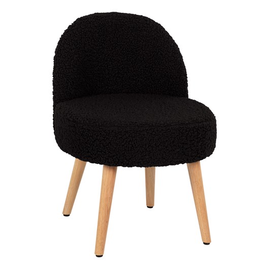 Σκαμπό με πολύ χαμηλή πλάτη YASMINE με επένδυση από ζεστό μπουκλέ ύφασμα σε ΜΑΥΡΟ απόχρωση, με ξύλινα πόδια σε φυσική απόχρωση.