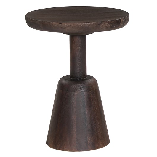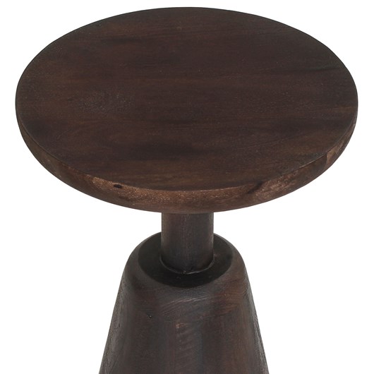 Το στρογγυλό τραπέζι σαλονιού CRABB που είναι εξολοκλήρου κατασκευασμένο από μασίφ ξύλο mango σε ΣΚΟΥΡΟ ΚΑΦΕ χρώμα μοιάζει με σκαμπό, χάρη στο κωνικό σχήμα της βάσης που καταλήγει στην στρογγυλή επιφάνεια. Ένα τραπέζι που θα εντυπωσιάσει με το σχήμα και το χρώμα του, αφού είναι sand blasted, προσδίδοντας εικόνα παλαιότητας στο έπιπλο.