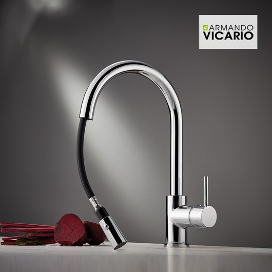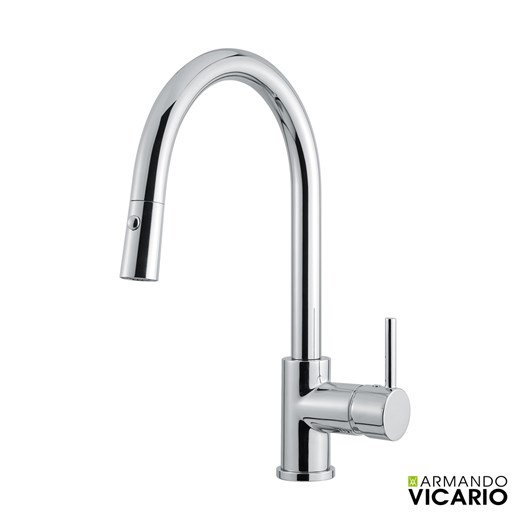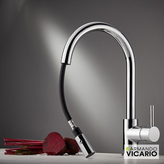 Μπαταρία νεροχύτου θερμομικτική Fluo με υψηλό περιστρεφόμενο ρουξούνι και συρόμενο ντους 2 λειτουργιών (shower/spray)