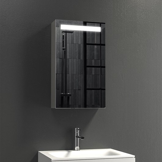 Επιτοίχιος φωτιζόμενος καθρέπτης με ντουλάπι. Φέρει κρυφό φωτισμό LED και είναι κατασκευασμένος από ανοξείδωτο ατσάλι.