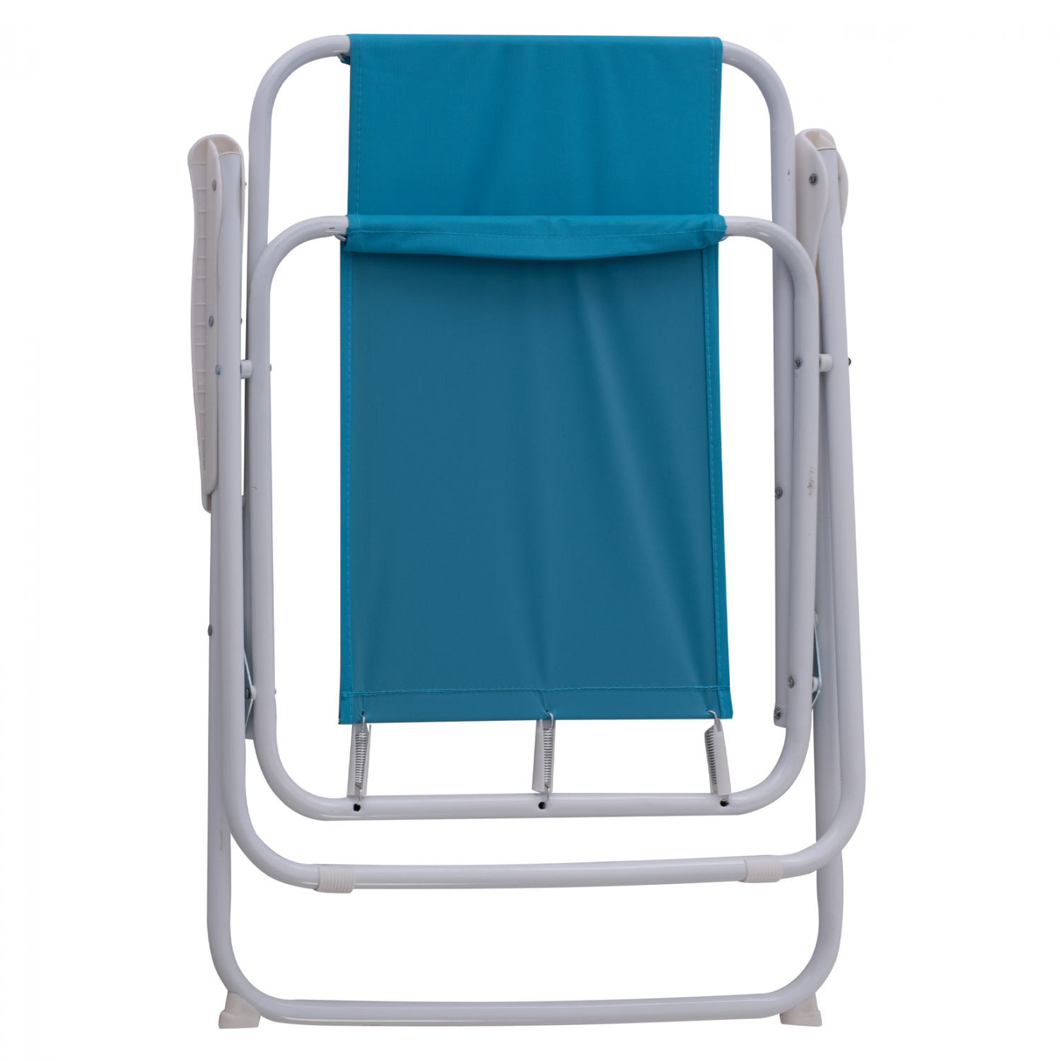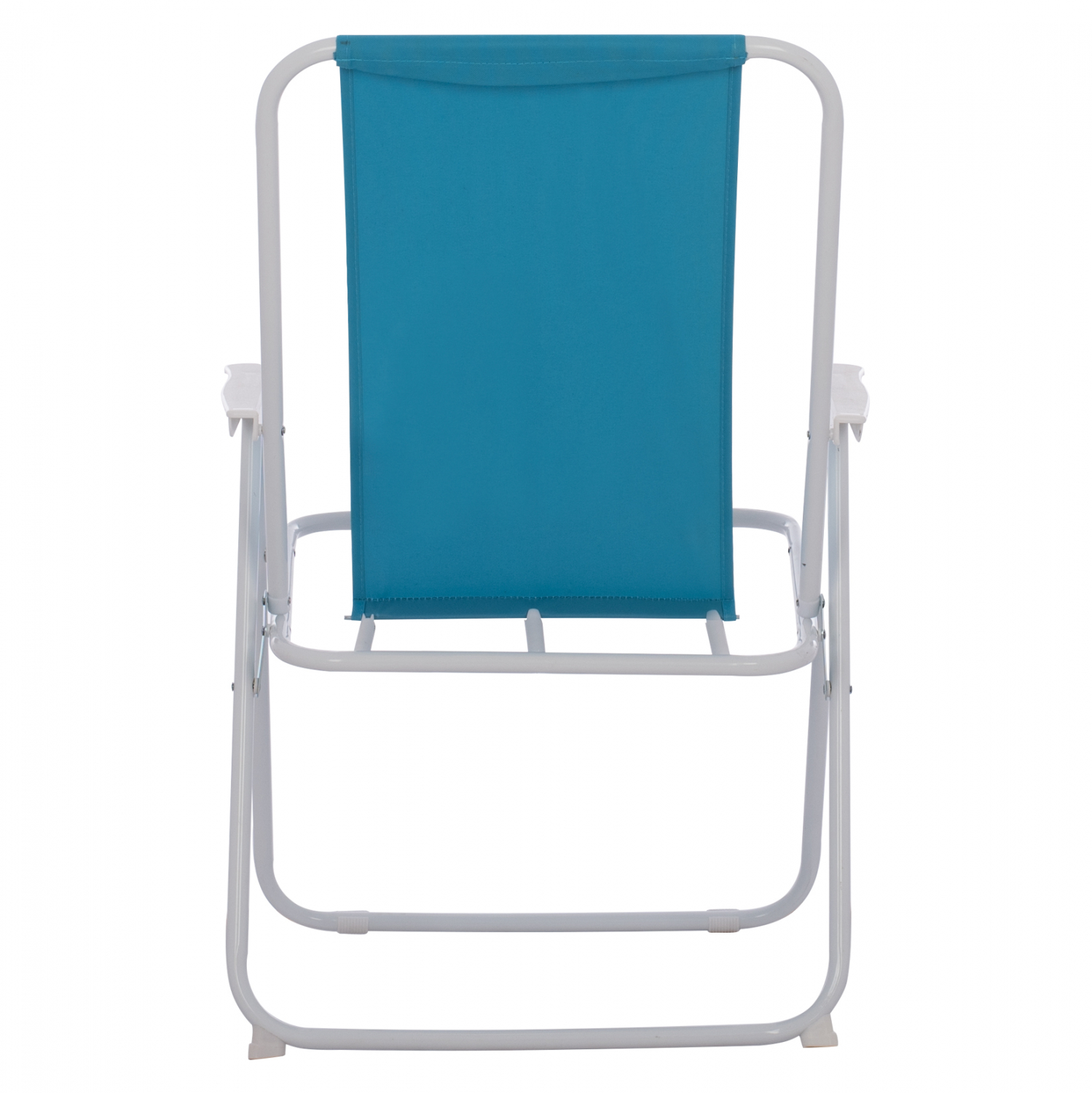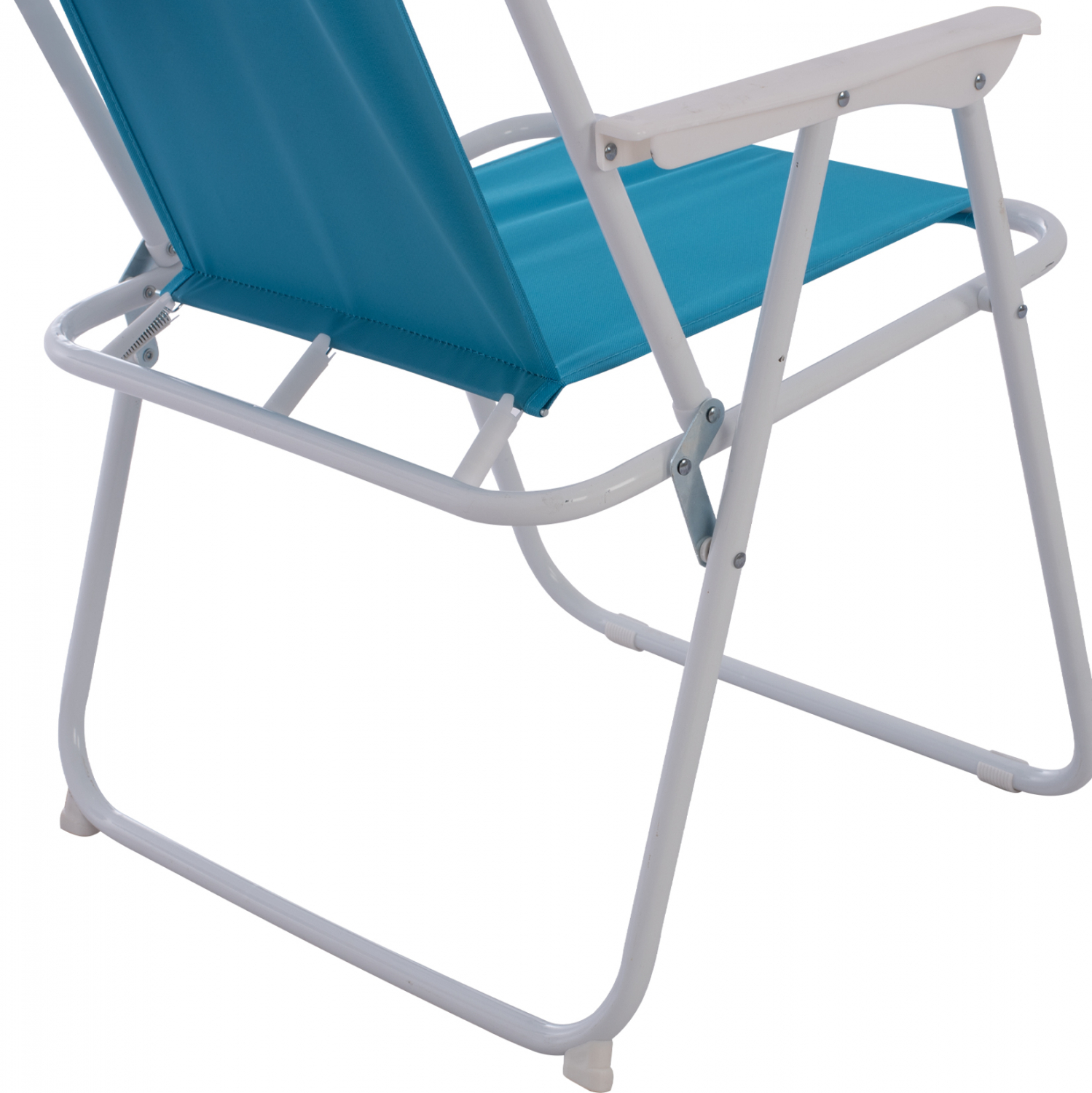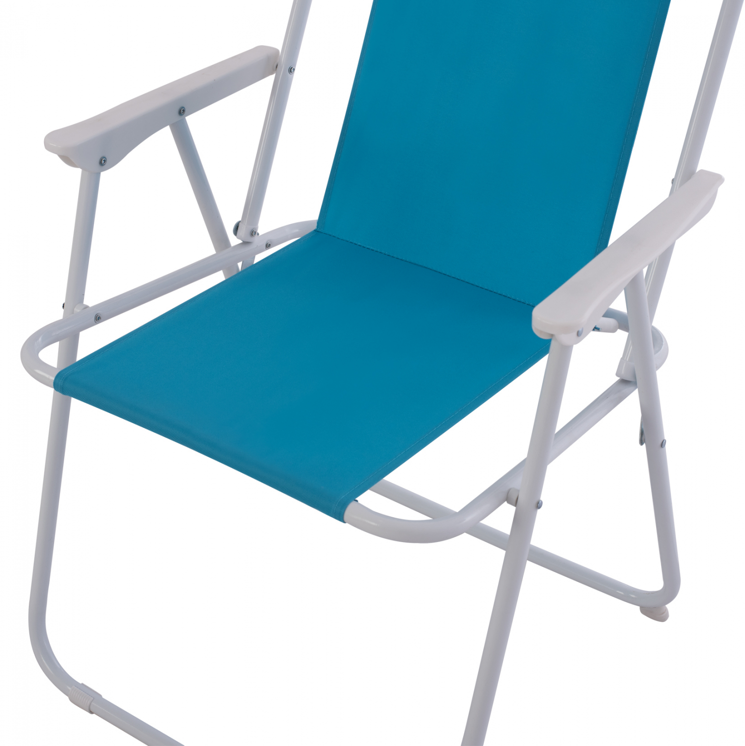 Καρέκλα παραλίας πτυσσόμενη μεταλλική με ψηλή πλάτη και σιέλ ύφασμα.