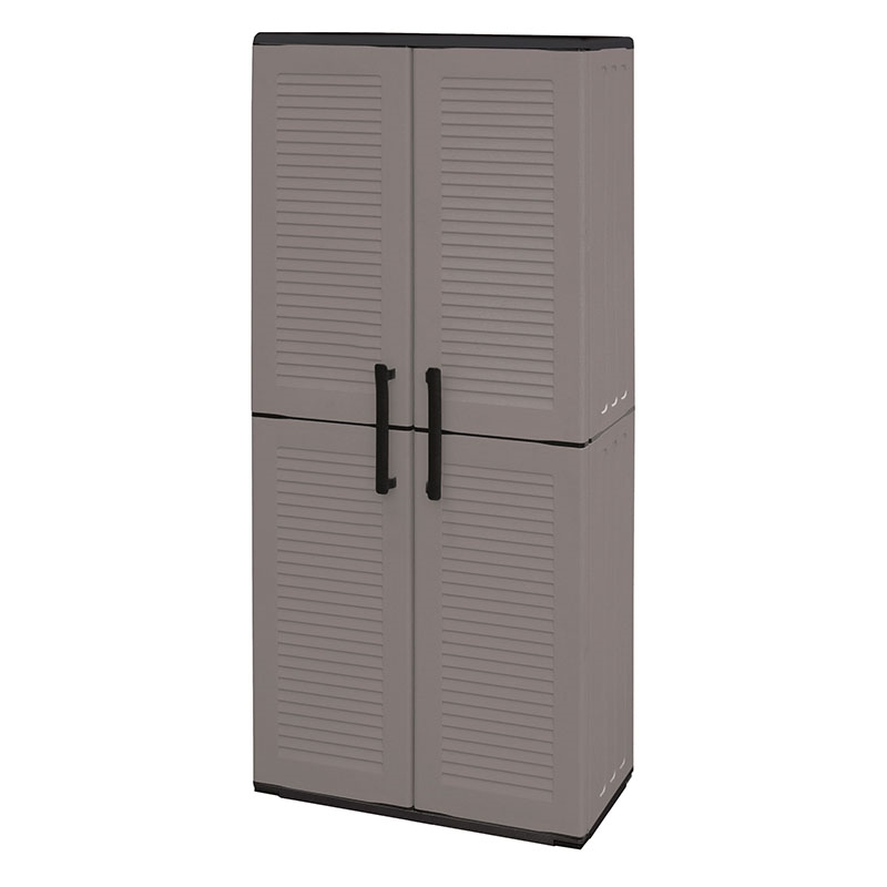 Ντουλάπα πλαστική δίφυλλη για εξωτερικούς χώρους. Ανθεκτική σε καιρικές συνθήκες χάρη στην επάνω επιφάνεια της ντουλάπας που καλύπτει τα φύλλα προστατεύοντάς το περιεχόμενο της. Διαθέτει ανοιγόμενα φύλλα και 3 εσωτερικά ράφια αποθήκευσης ώστε να εφαρμόζουν στο επιθυμητό ύψος και εσωτερικό χώρισμα δίνοντας τη δυνατότητα να αποθηκεύονται ψηλά αντικείμενα και οικιακές συσκευές όπως εργαλεία, σκούπες, σφουγγαρίστρες κλπ.