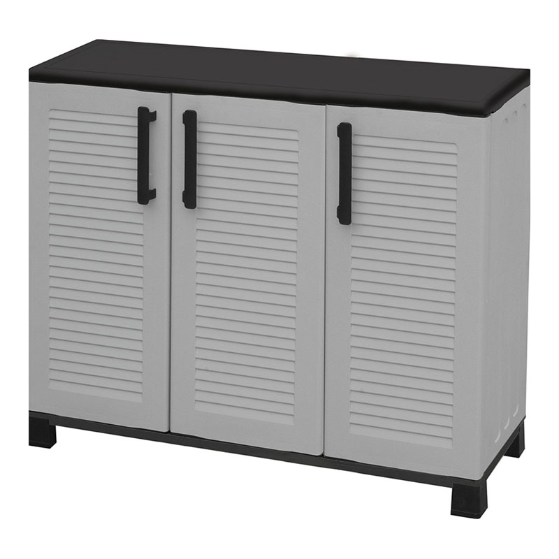 Ντουλάπα πλαστική τρίφυλλη με πόδια για εξωτερικούς χώρους. Ανθεκτική σε καιρικές συνθήκες χάρη στην επάνω επιφάνεια της ντουλάπας που καλύπτει τα φύλλα προστατεύοντάς το περιεχόμενο της. Διαθέτει ανοιγόμενα φύλλα και 1 εσωτερικό ράφι για αποθήκευση μικρών και μεγάλων αντικειμένων όπως οικιακές συσκευές, εργαλεία κλπ.